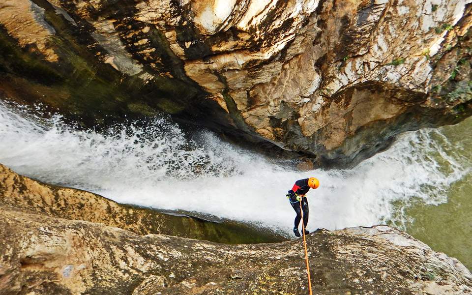Η καταρρίχηση στις σχισμές του βουνού, ανάμεσα σε χαρουπιές και σκίνους, είναι ο καλύτερος τρόπος για να γνωρίσουμε μια όψη του νησιού που δεν ξέραμε ότι υπάρχει.