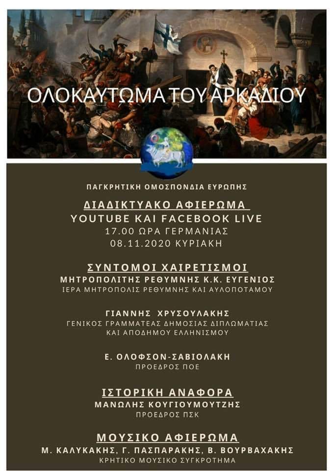 Κυριακή 8 Νοεμβρίου 2020 η Παγκρήτια Ομοσπονδία Ευρώπης πραγματοποιεί διαδικτυακό αφιέρωμα για το ολοκαύτωμα του Αρκαδίου. Συντονιστείτε!