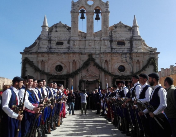 Με λαμπρότητα τιμάται σήμερα στην ιστορική Μονή Αρκαδίου, 150 χρόνια μετά, η μεγαλύτερη ομαδική εθελοθυσία με πλήθος επετειακών εκδηλώσεων. Η μονή Αρκαδίου έγινε ένδοξη και παγκόσμια γνωστή με το ολοκαύτωμά της κατά την μεγάλη Επανάσταση του 1866-1869.
